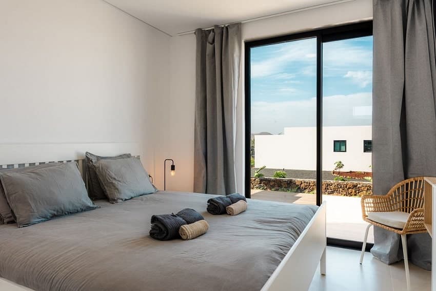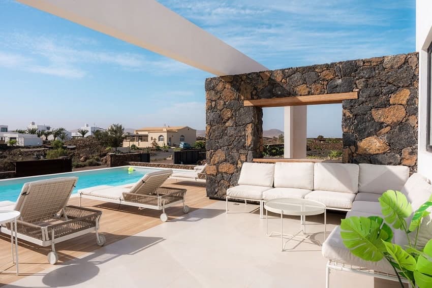 En el exterior le espera la relajación absoluta. Cuenta con una gran terraza solárium, piscina privada climatizada, cómodas tumbonas y vistas impresionantes al paisaje volcánico que rodea la propiedad. Disfrute del sol canario, relájese junto a la piscina o contemple el cielo estrellado sobre Lajares al caer la noche.