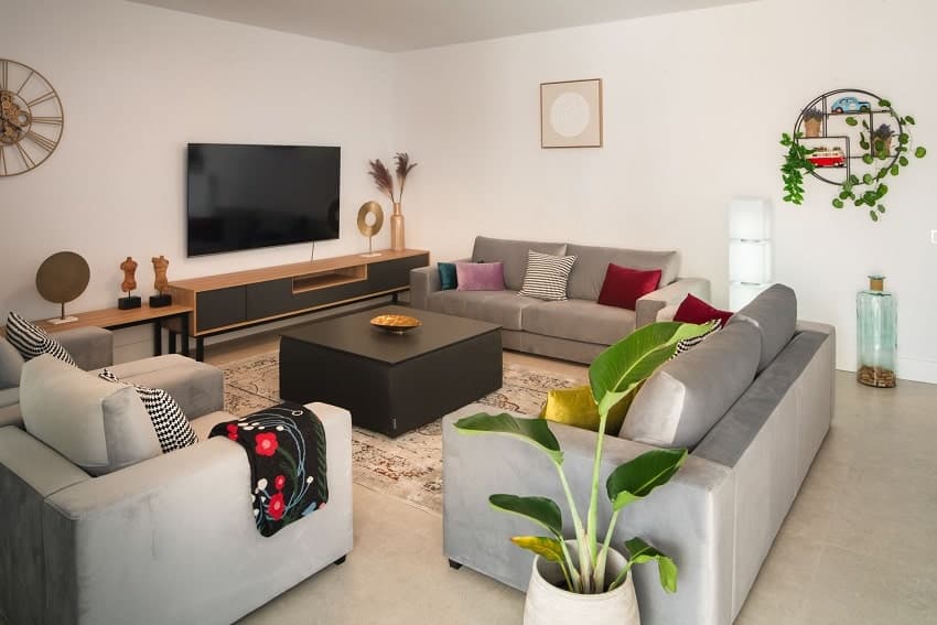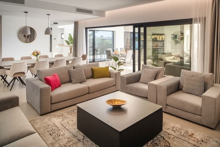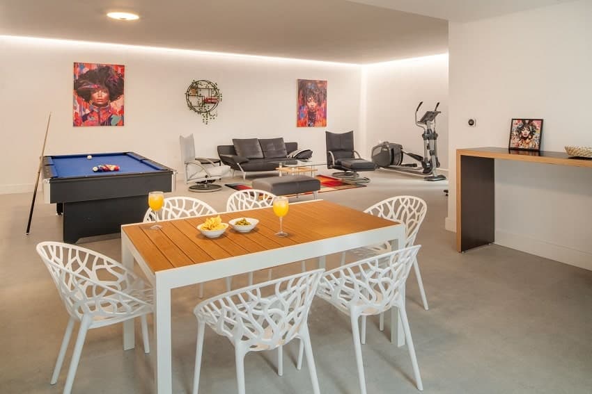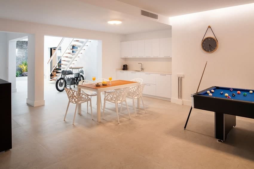 En la planta baja, además de tres dormitorios con acceso directo a pequeños espacios exteriores privados, se encuentra una amplia sala de ocio con mesa de billar, cocina auxiliar y sofá.
