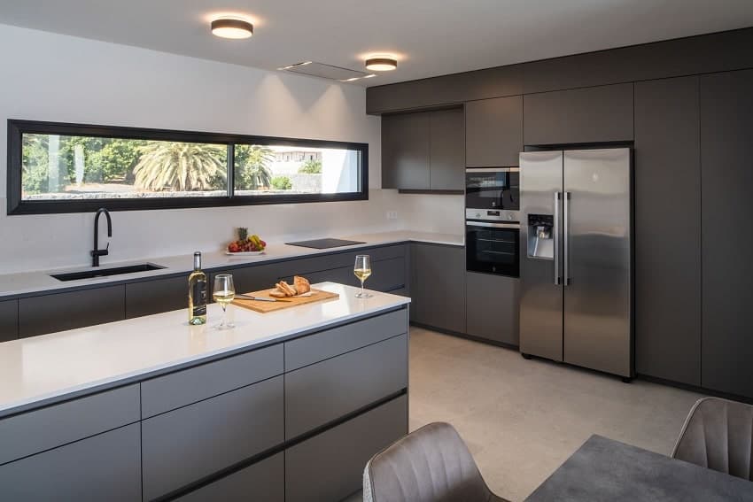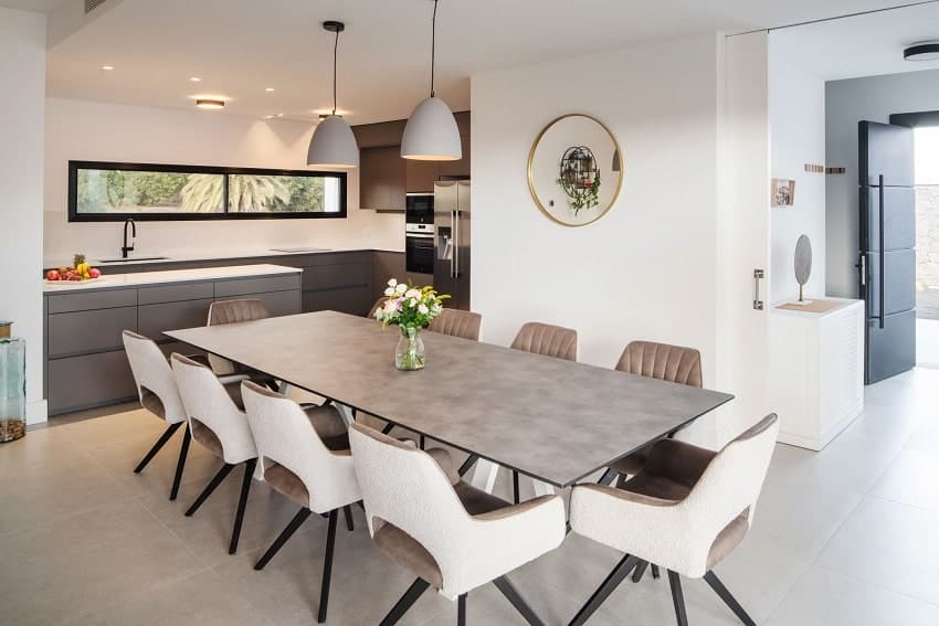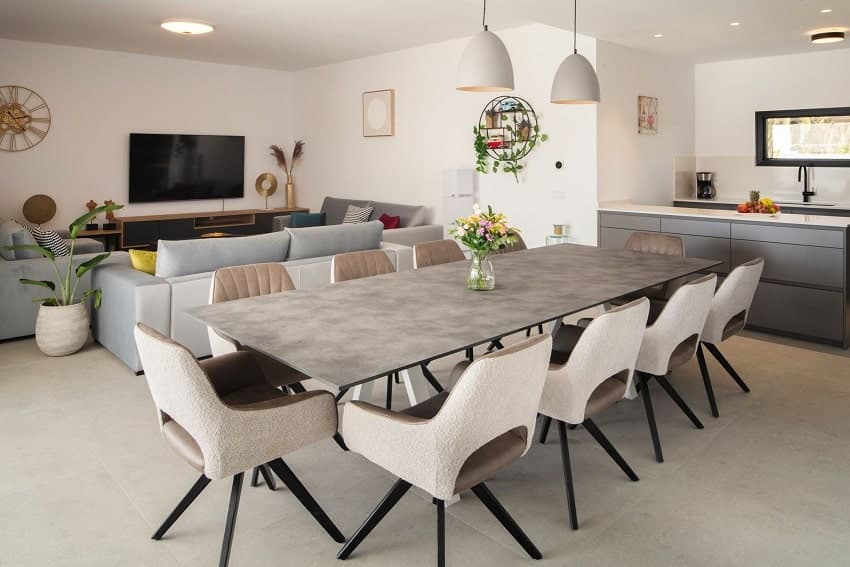 La zona central de la vivienda es de concepto abierto e integra una cocina de última generación con un elegante comedor y un acogedor salón. La sensación de amplitud es luminosa, de alta calidad y a la vez minimalista y clara. Un aseo de invitados completa esta área.