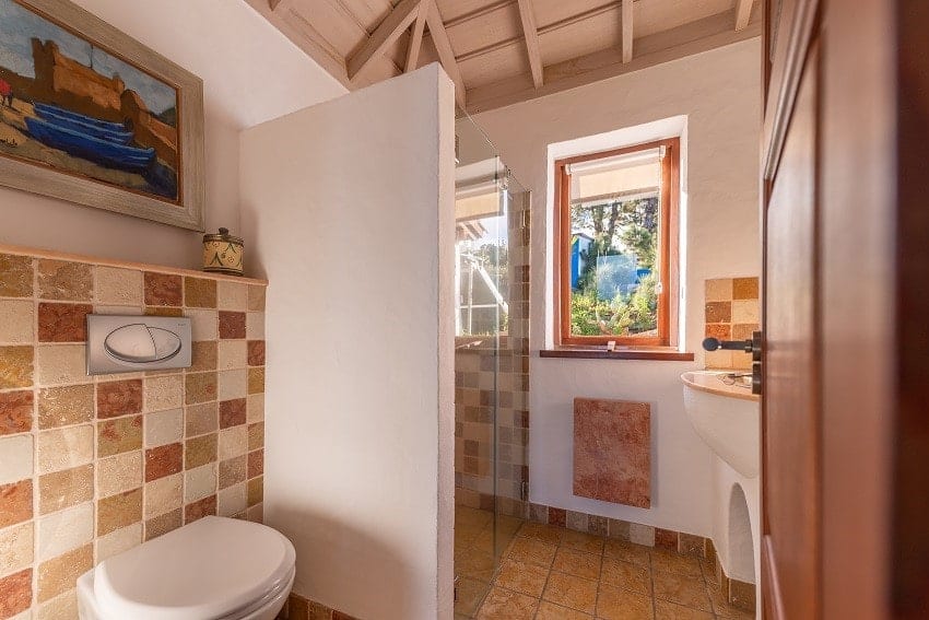 Furthermore, in the large living room there is the dining area with a table made of solid wood. The large windows provide plenty of light throughout the day. The wood-burning stove spreads cosy warmth in a cosy living ambience on the few cooler days. Additionally, the house also has free heating from 1.11. to 31.3. in the bathroom and a part of the living room (underfloor heating). The bathroom features elegant travertine tiles and a hammered silver wash basin handcrafted in Morocco.