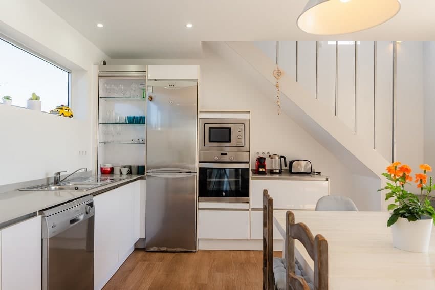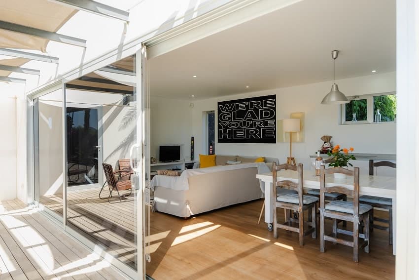 The open-plan living area combines a modern, fully equipped kitchen with an inviting dining space and a comfortable sofa. Additionally, large floor-to-ceiling windows open up to the outdoor area, creating a harmonious flow between indoor and outdoor living.