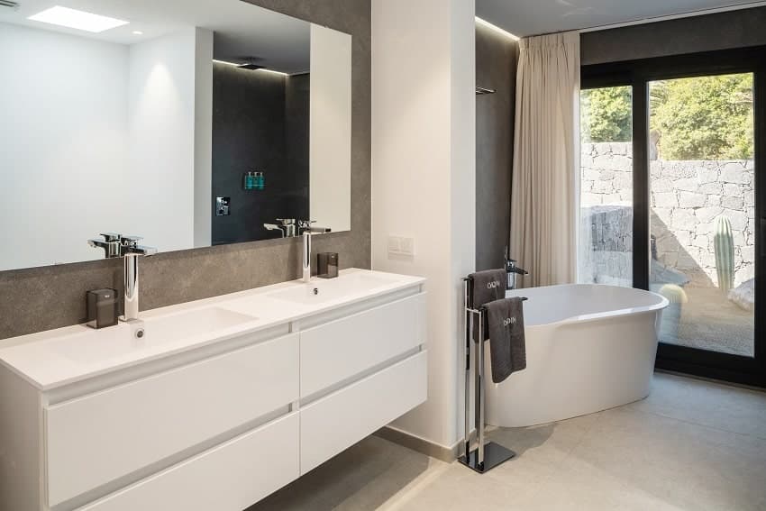 The outdoor area continues the luxurious atmosphere. The private pool serves as the centerpiece, surrounded by comfortable sun loungers, a stylish lounge area, a dining table, and a hot tub. A barbecue area completes the outdoor experience, offering the perfect setting to enjoy the island’s mild climate.
