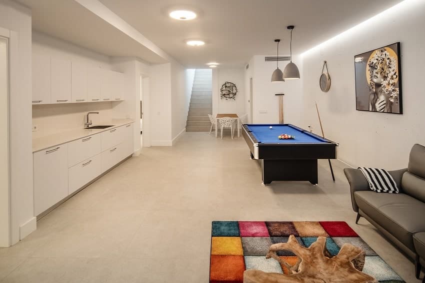 On the lower level, you will find two additional bedrooms. Each has an en-suite bathroom and a small private outdoor space. There is also a dedicated leisure area. A pool table, several fitness machines, and a cozy TV lounge with a kitchenette provide extra entertainment during your stay.