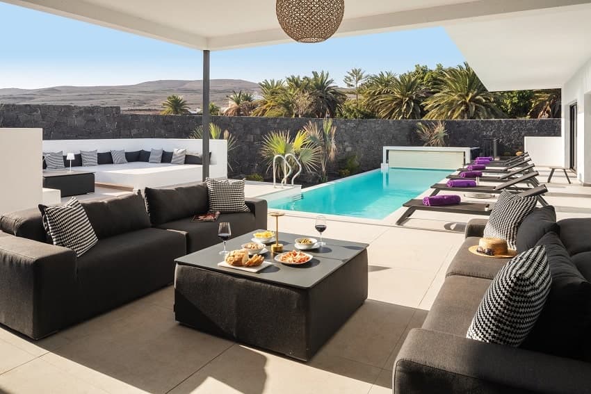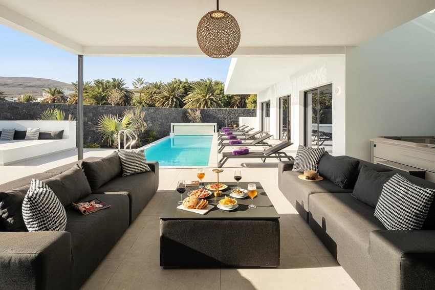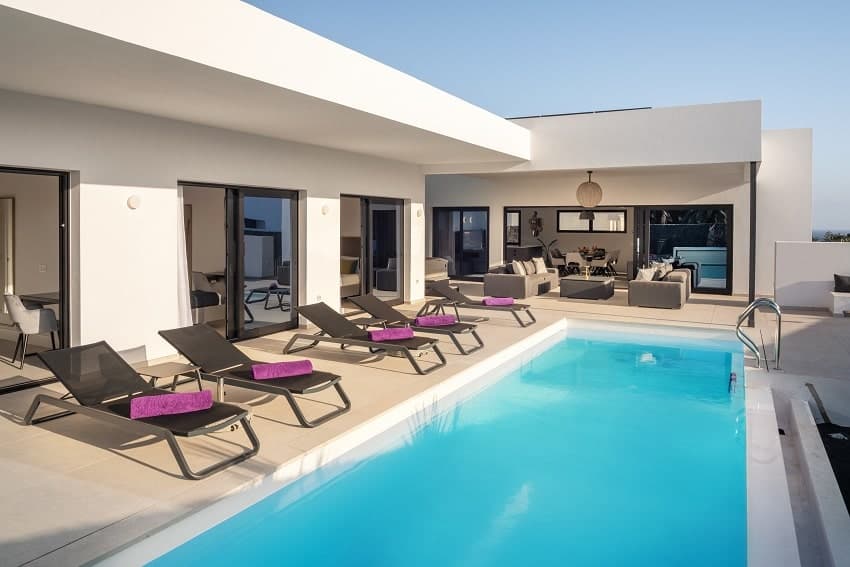 Outstanding holiday home in Puerto Calero featuring modern, minimalist architecture, a private pool, hot tub, and 5 bedrooms.