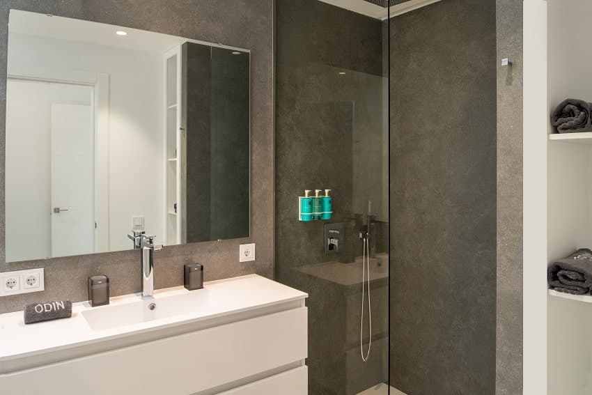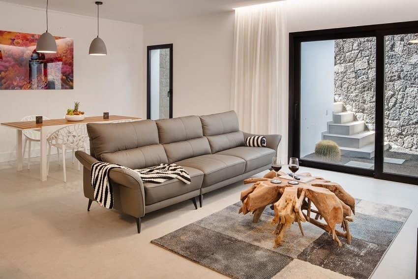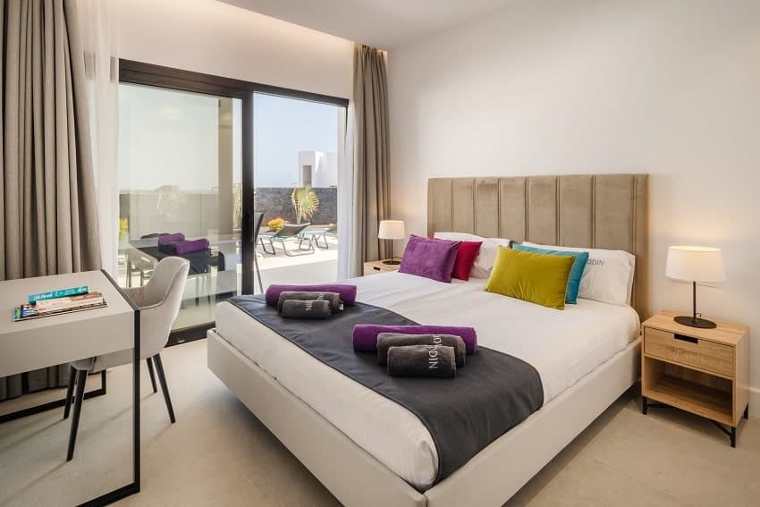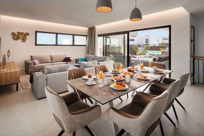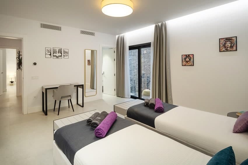 The holiday villa in on Lanzarote impresses with its clean architectural lines, bright spaces, and a southwest orientation, creating a warm, sun-filled atmosphere. The five bedrooms are elegantly furnished, each featuring a private bathroom and individually controllable air conditioning. The master bedroom additionally offers a walk-in closet and a freestanding bathtub. Three of the bedrooms are located on the ground floor, while the remaining two are in the lower level.