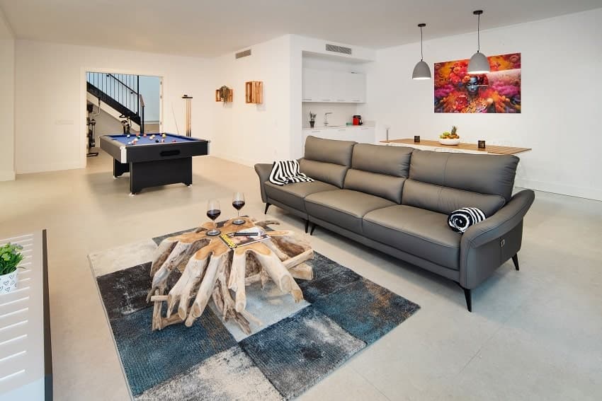 On the lower level, in addition to two bedrooms, there is a recreational room with a pool table, TV lounge, and kitchenette.